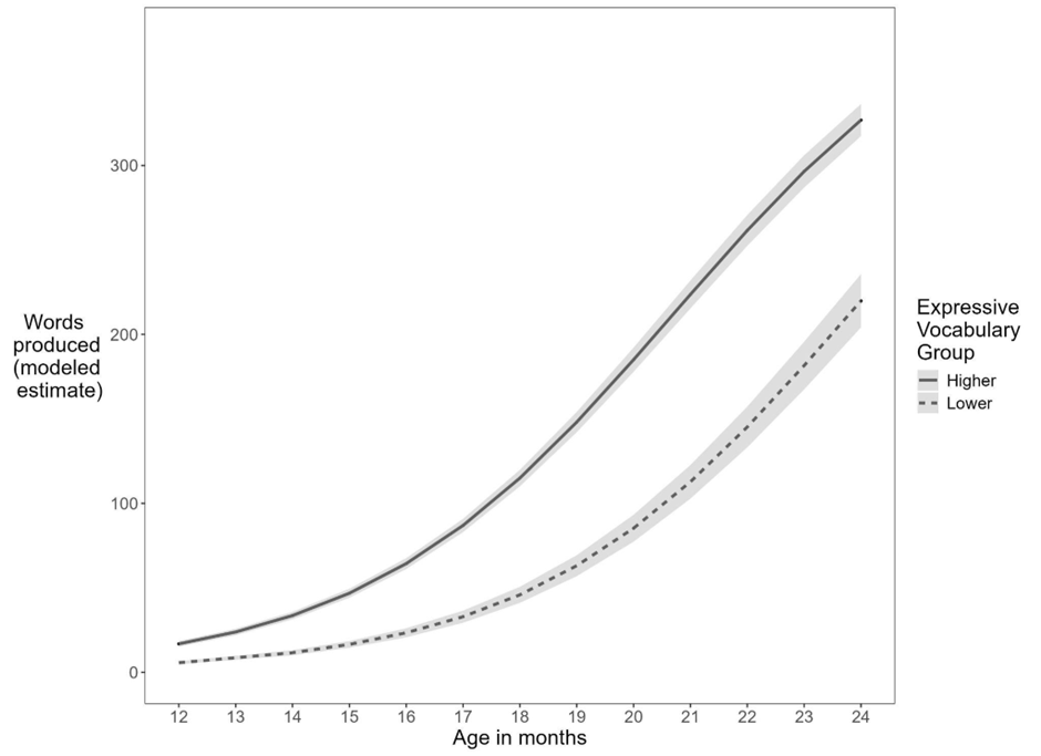 Figure 1. Predicted expressive vocabulary growth over age for children classified with higher (n = 71) and lower (n = 21) expressive vocabulary at first administration (12-16 months) based on the main effects only model (Model 2). Shaded area indicates +/- 1 SE.