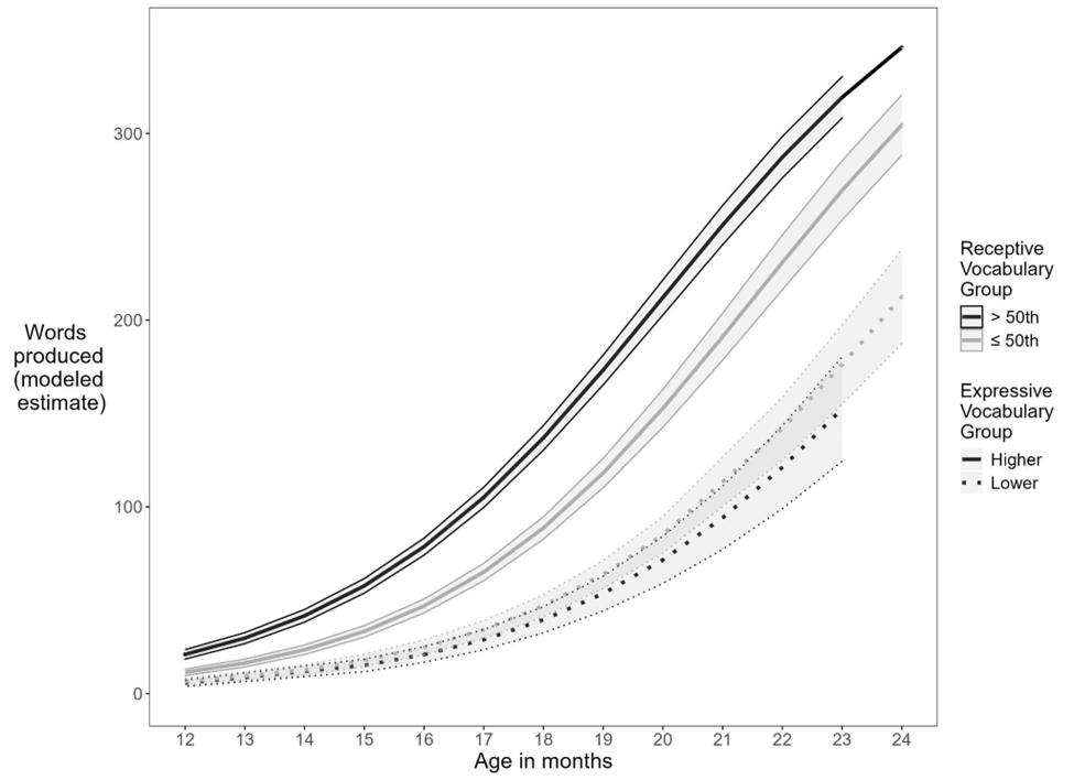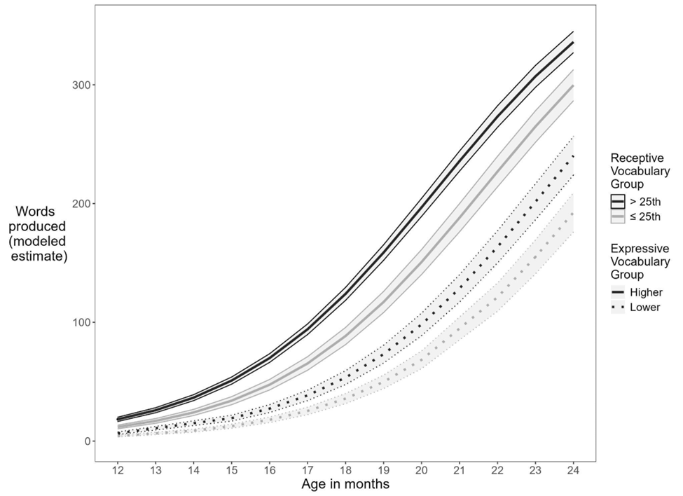 To further illustrate, at 18 months, the modeled expressive vocabulary size for toddlers with higher scores in both expressive and receptive vocabulary (>25th percentile) was about 124 words, about 35 words higher than for toddlers who had higher expressive scores, but with receptive scores ≤ 25th percentile (88 words). Similarly, the modeled expressive vocabulary size for toddlers with lower initial scores who also had ≤ 25th percentile receptive scores was about 36 words, almost 20 words fewer than for toddlers with lower initial scores who had higher (>25th percentile) receptive scores (54 words). These differences persisted until 24 months, such that toddlers with higher initial expressive scores but lower (≤ 25th percentile) receptive scores were predicted to produce about 300 words, about 35 fewer words than their higher-expressive peers with > 25th percentile receptive scores (336 words). Importantly, by 24 months, toddlers who had lower initial expressive scores and also had ≤ 25th percentile receptive scores were predicted to produce only 193 words, nearly 50 words fewer than their lower-expressive peers with higher receptive scores (240 words).